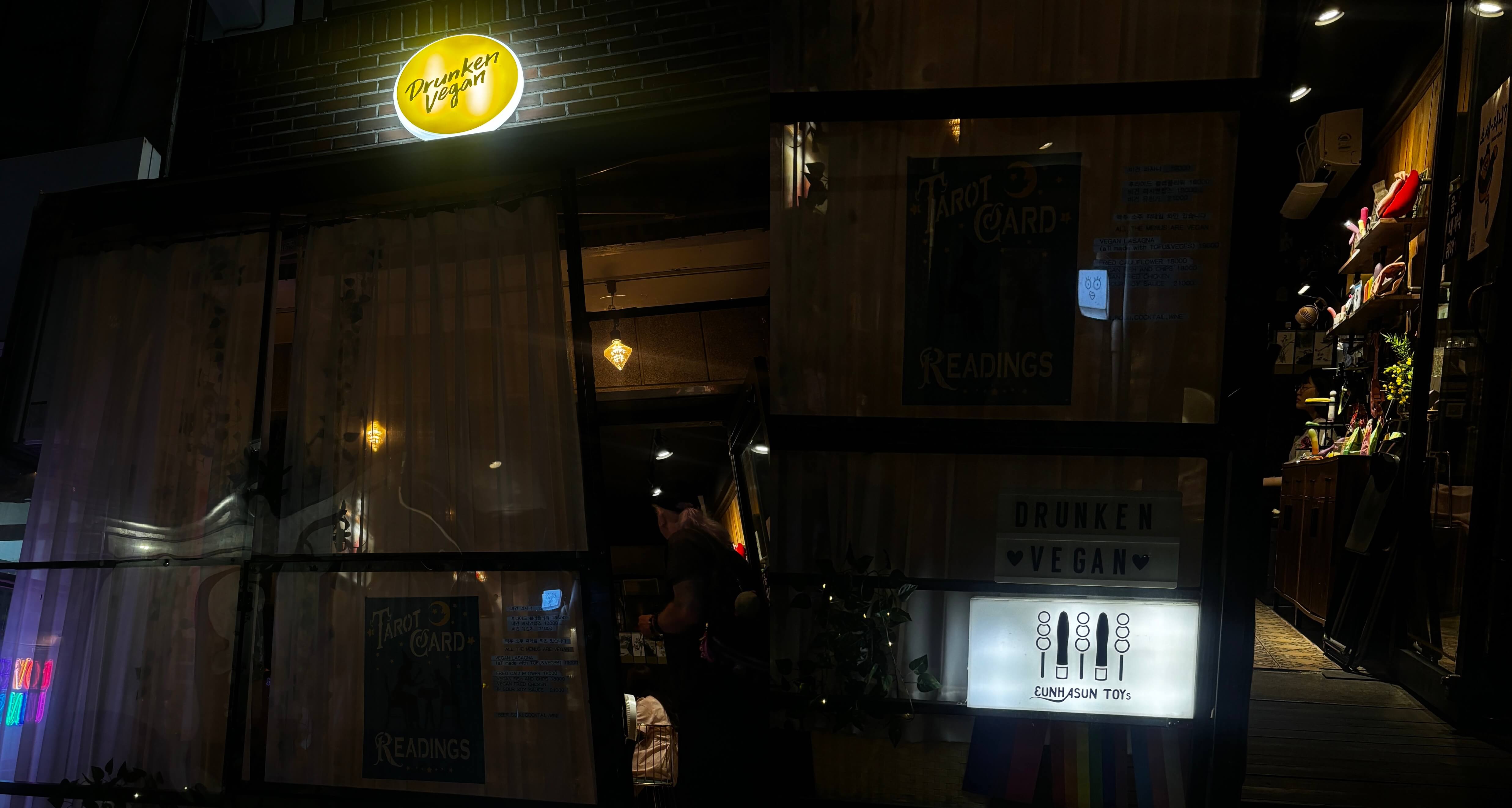 After spending the whole day watching people dance we felt rather hungry so we started wandering north – searching for the highly rated Drunken Vegan. The place was very small – 3 tables inside and one outside, but it was the wall of Dildo’s and sex toys in all shapes and sizes (literally) that made us double take.