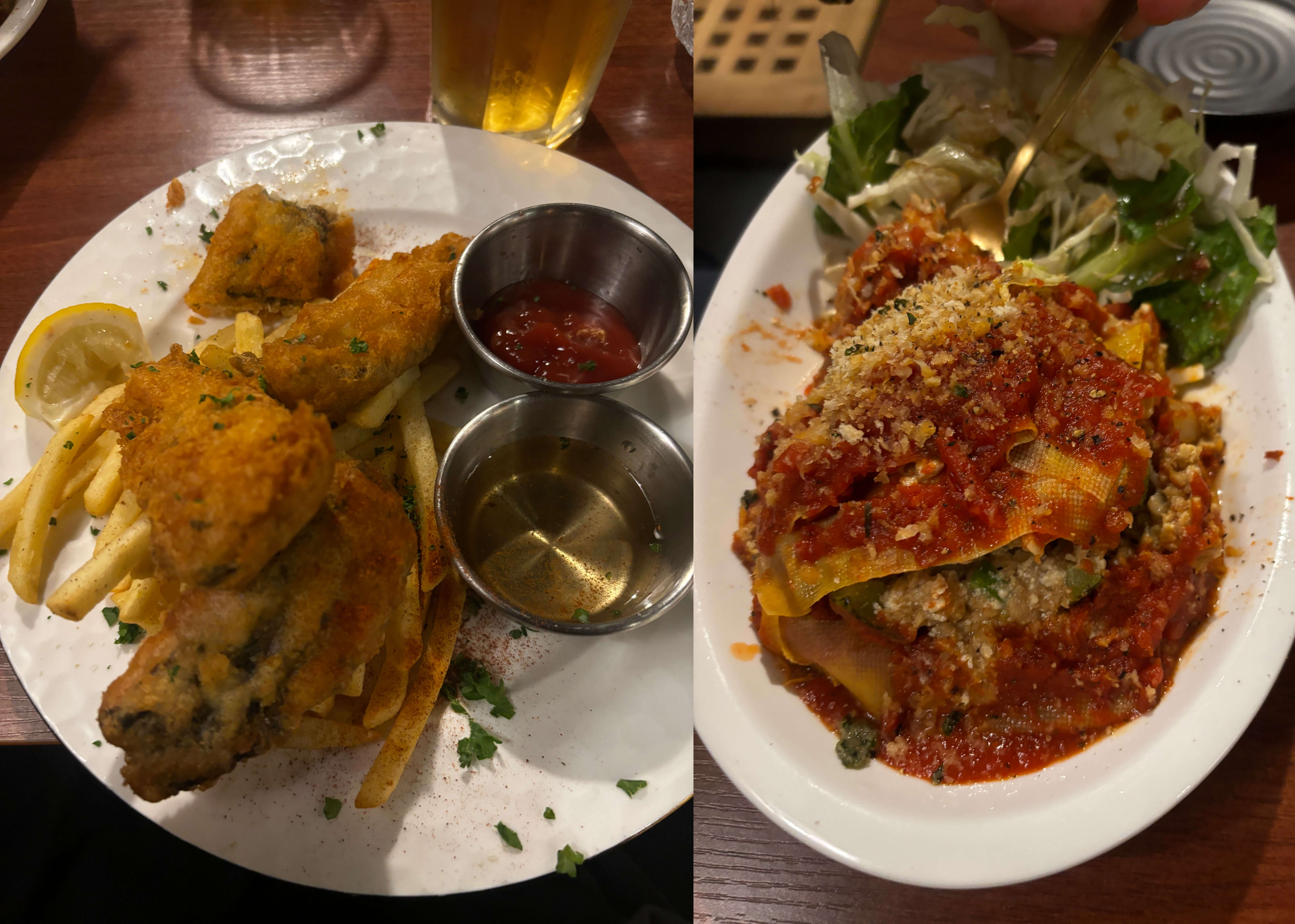 We sat down and ordered, Vegan fish and chips, Lasagne and two beers – all of which were really really good!
