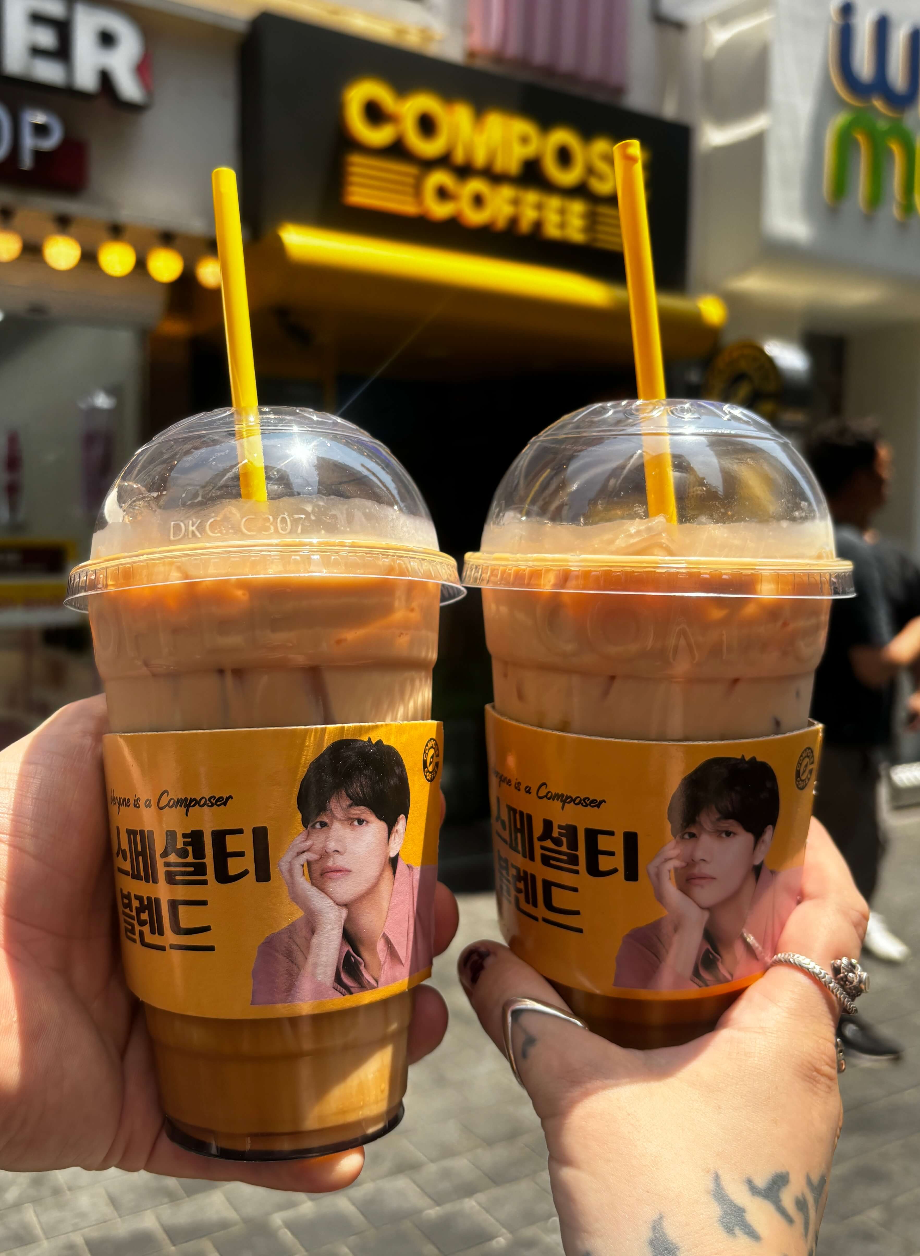 A small shop up a flight of stairs – near the smoking area for all of the Myeongdong businesses. We got our drinks to go and found a local green area outside the bank with some seating areas and drank them here – whilst we opened our K-pop albums. I think this was as per usual really really good!