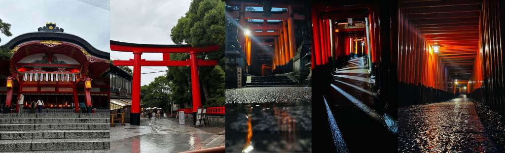 So we gave up on the stream and the commercial crap alongside it, got some McDonald’s Chips (the only thing we found to eat for Vegetarians and headed to Inari Temple. The Temple is open 24 hours a day – thank Buddha! but by the time we got to the bus terminal at the bottom of the mountain, it was pouring down with rain! We bought a see-through Umbrella and set off towards the famous Orange Gates. By now it was 6pm, the rain was cascading off the brolly and we walked with about 600 other people up to the Temple – this is again quiet, aparently in the morning there can be 60,000 people heading for the first row of Tojii gates by 7am.