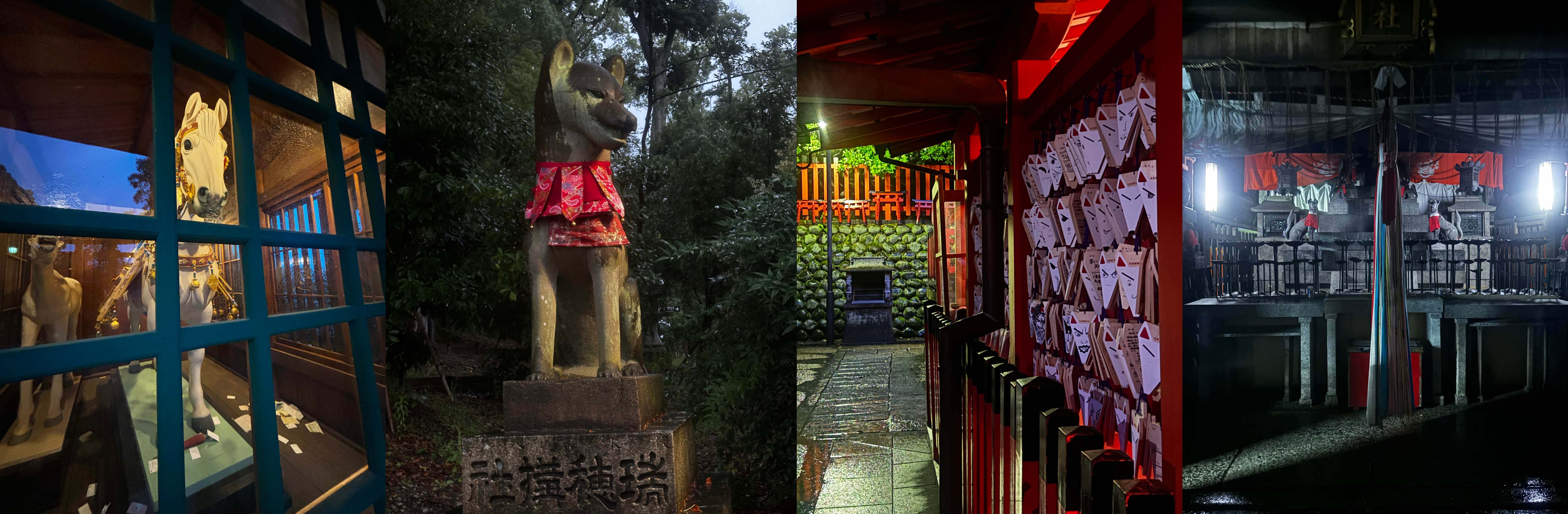 So we gave up on the stream and the commercial crap alongside it, got some McDonald’s Chips (the only thing we found to eat for Vegetarians and headed to Inari Temple. The Temple is open 24 hours a day – thank Buddha! but by the time we got to the bus terminal at the bottom of the mountain, it was pouring down with rain! We bought a see-through Umbrella and set off towards the famous Orange Gates. By now it was 6pm, the rain was cascading off the brolly and we walked with about 600 other people up to the Temple – this is again quiet, aparently in the morning there can be 60,000 people heading for the first row of Tojii gates by 7am.