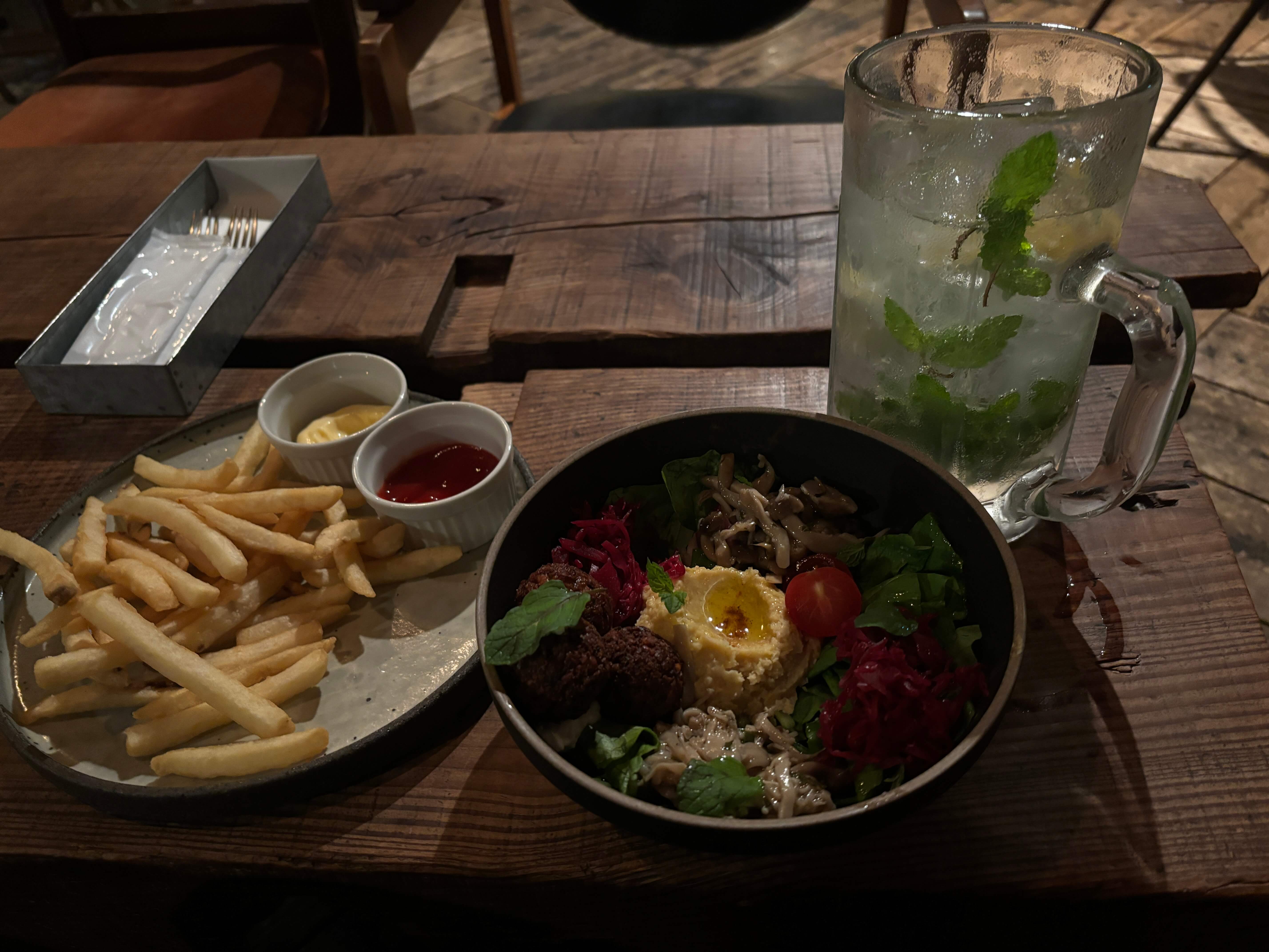 A HUGE glass of IPA and a ‘Litre Mojito’. We also order two Falafel with Pitta, fries and Hummus – not very Japanese and by this stage that was a bonus!