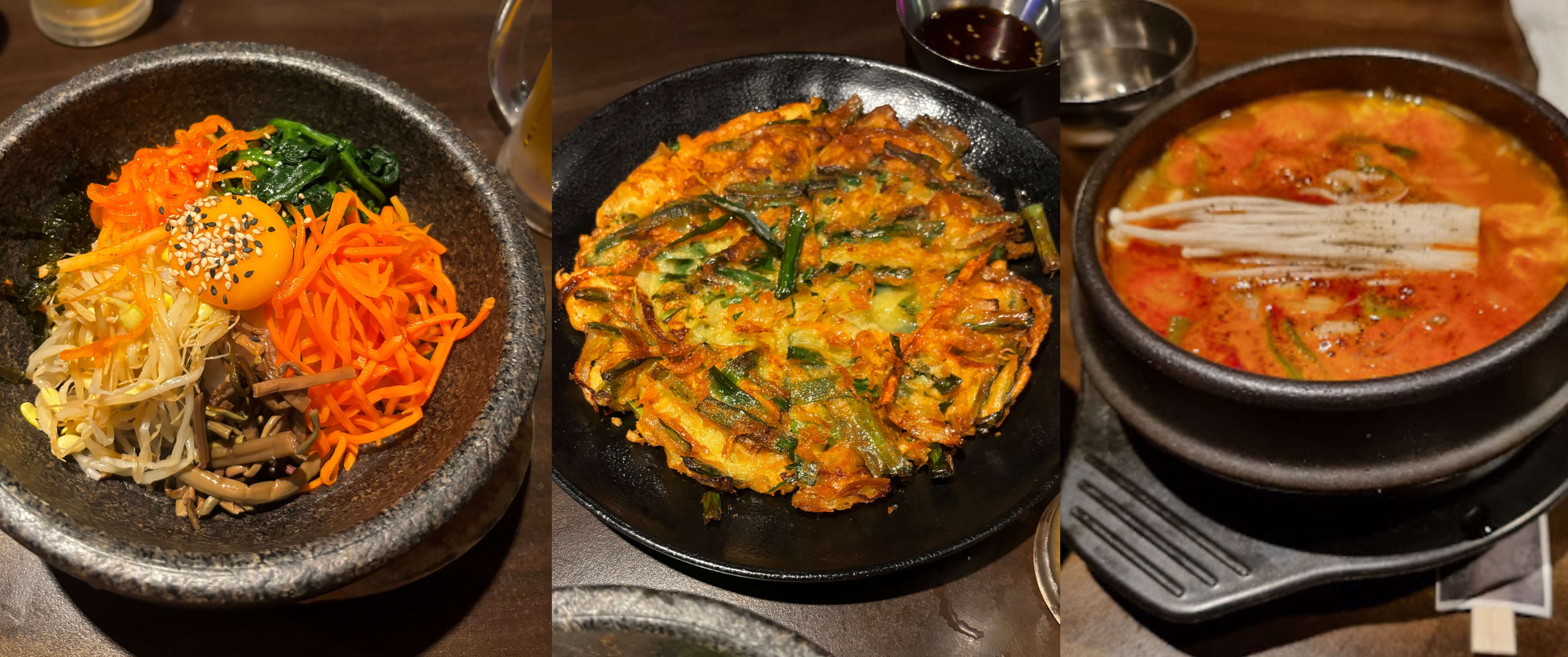 Ash got Chicken Jjigae, Bob got Dolsot Bibimbap and a Spring onion Jeon