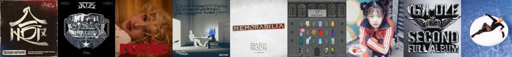 Hop – Stray Kids, Ate – Stray Kids, Rosie – Rosé, Daydream – Enhypen, Memorabilia – Enhypen, Right Here – Seventeen, Strawberry Rush – Chuu, Second Full Album – (G)Idle, O – Hwasa