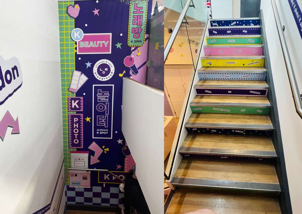 We got to Haymarket on Monday lunchtime and walked up and down looking but couldn’t see any new shop fronts with KPop Playground on it was only when we stopped to search the app that we spotted a banner with the purple logo and a sign saying ‘Downstairs’ inside one of those crappy London Souvenir shops. You head past the rows of plastic Big Bens and hats saying I Love London, down a flight of stairs and into the pink and purple basement.