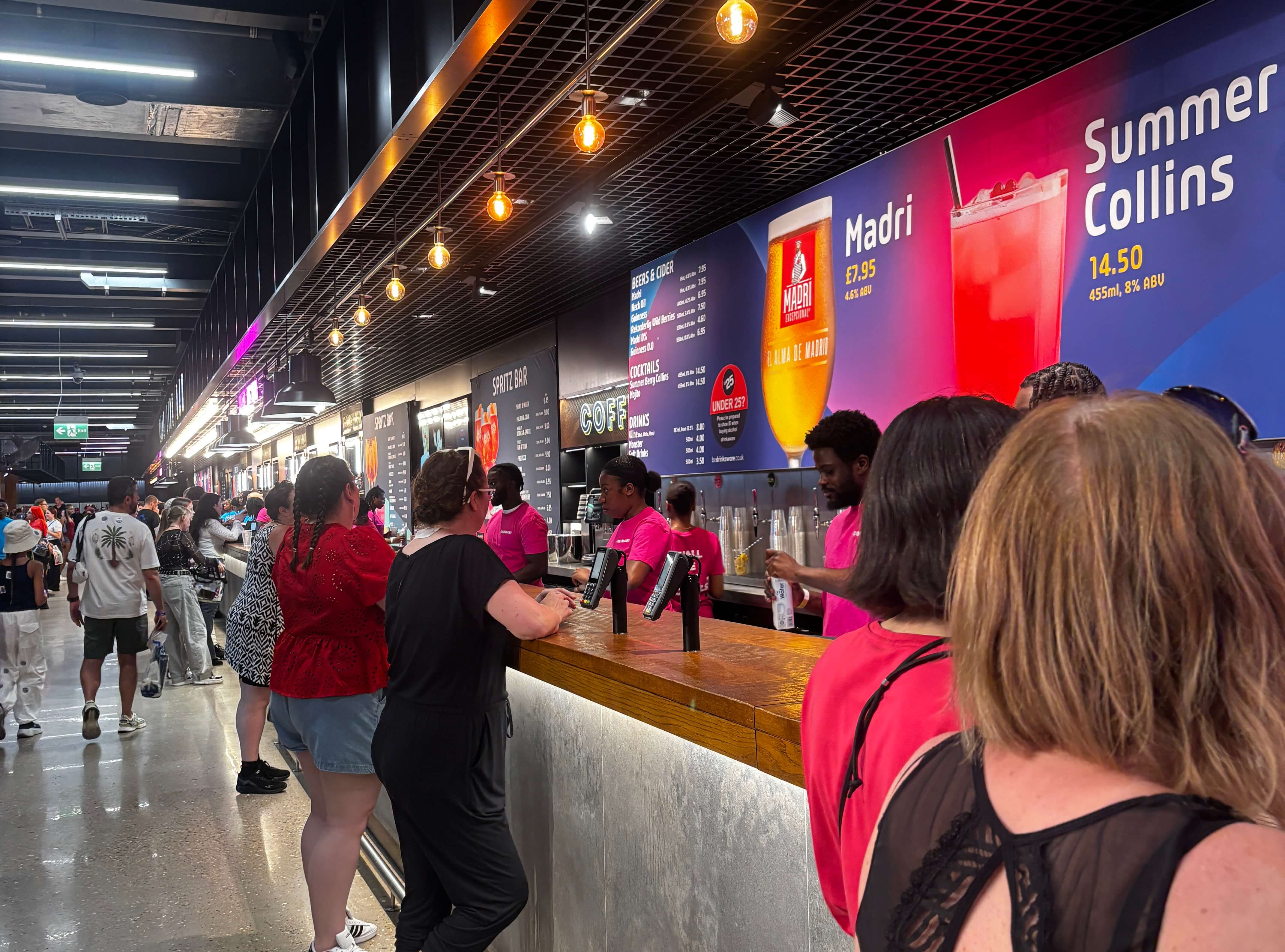 Up the flights of stairs to the entrances, we entered what some consider holy ground and others (Ash included) consider enemy ground, if they are an Arsenal Fan! Inside a cacophony of talking and excited chatter hit as the masses sat, drank and ate in anticipation of the main event. Food and drink is in abundance here…. apart from vegan/veggie food that had apparently gone in the first 30 mins so we instead opted for Cider!