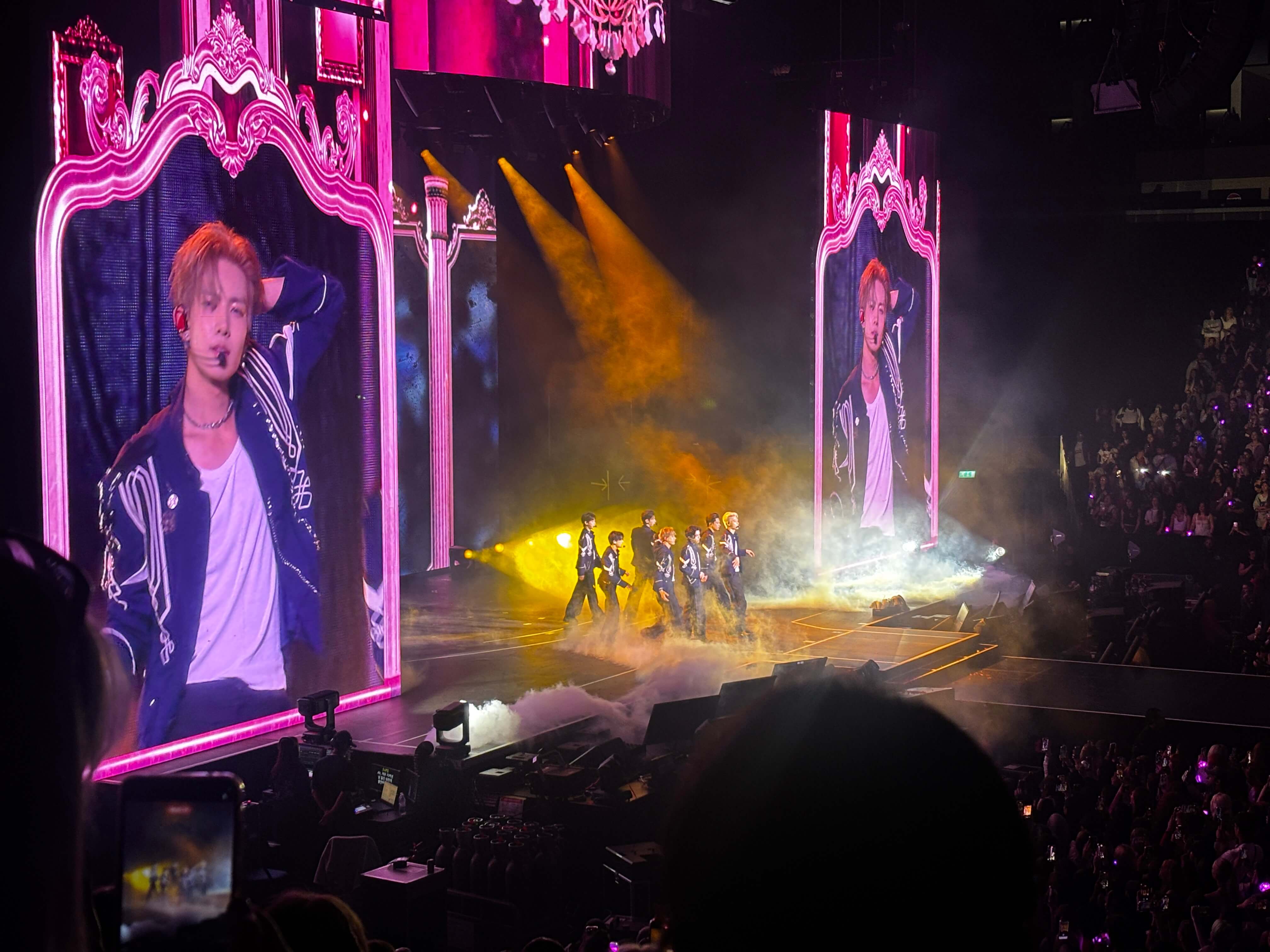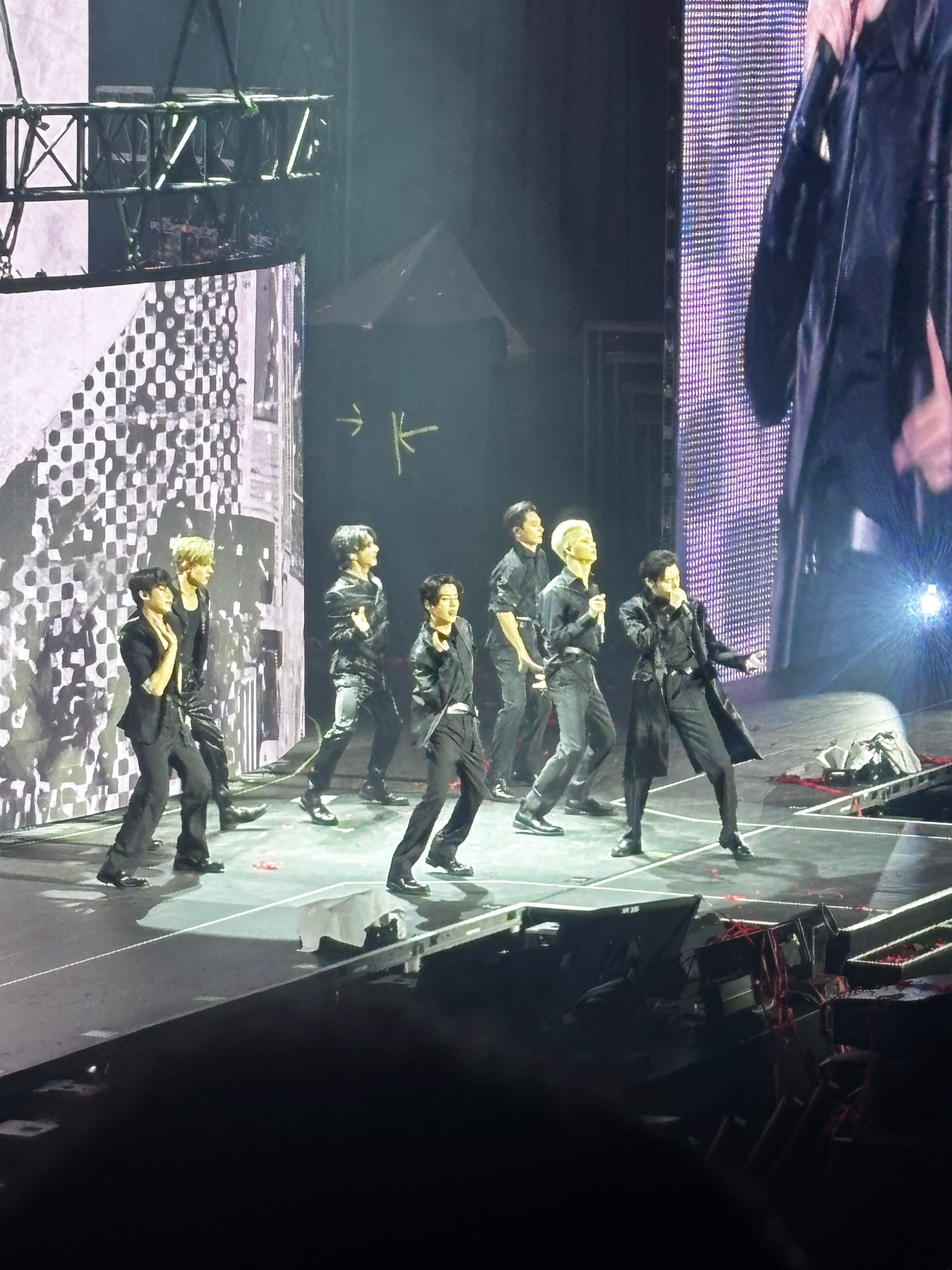 Then after what seemed like an eternity later the lights dimmed the screens began playing imagery and suddenly the screams exploded as each of the members appeared one by one. All dressed in black leather, velvet and silk. Then everyone who was seated rose and stood up (just like at Stray Kids) so up we got.