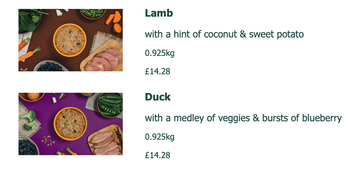 The deliveries arrived damaged and the weight distribution was peculiar whereas one dog was given a pack of 6 – 500g dish of wet food with the concept of using 3/4 of the dish per meal. The other dog was given double the amount of tins (12) weighing 250g with the idea of giving them 1 and a 1/4 dishes per meal – there was absolutely no reason given but it made feeding times confusing as hell! The second delivery arrived and was a pack of 24 with the tins only weighing 90g so give the dog 4 and 1/4 tins per meal. The dogs both had a bad reaction to the food and had bad stomach ache and the humans were too confused and turned around at the stupid allocation of food.