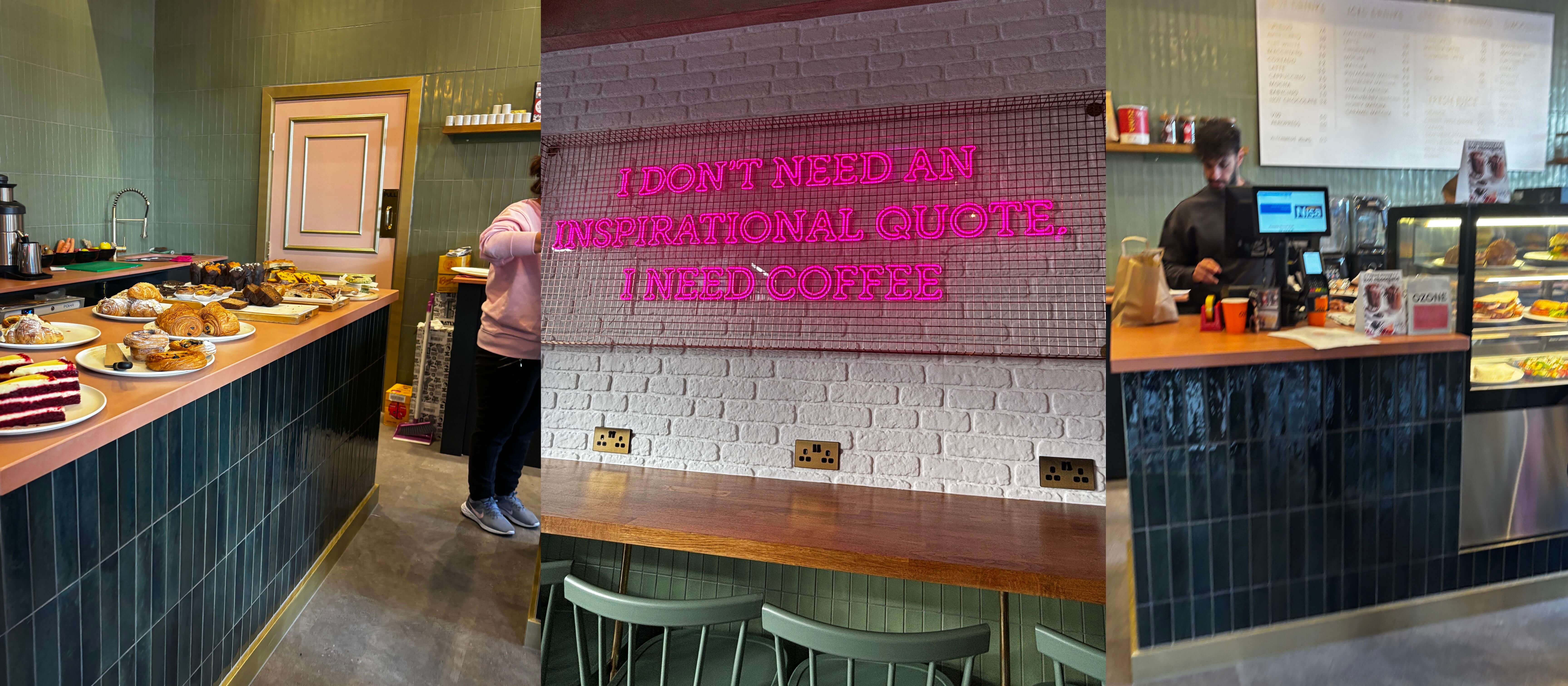 A couple of months back a new sign and new paint covered the front of the building and we hoped for new life. Eventually in November we noticed Clear Hearts was open so we made a B-Line for the familiar. What we found was a lot more polished and a ‘proper’ Coffee Shop, still owned by the same people, just a lot more. There is real seating areas and counters with food and staff all in uniforms. We ordered the usual 2 Oat Mochas and waited, looking around at the very Pink and Rose Gold interior and surprisingly there isn’t a scrolly font neon sign or any fake greenery on the walls like all other shops in the area, instead some inspirational and honest quotes which are neon but in a bold dramatic style.