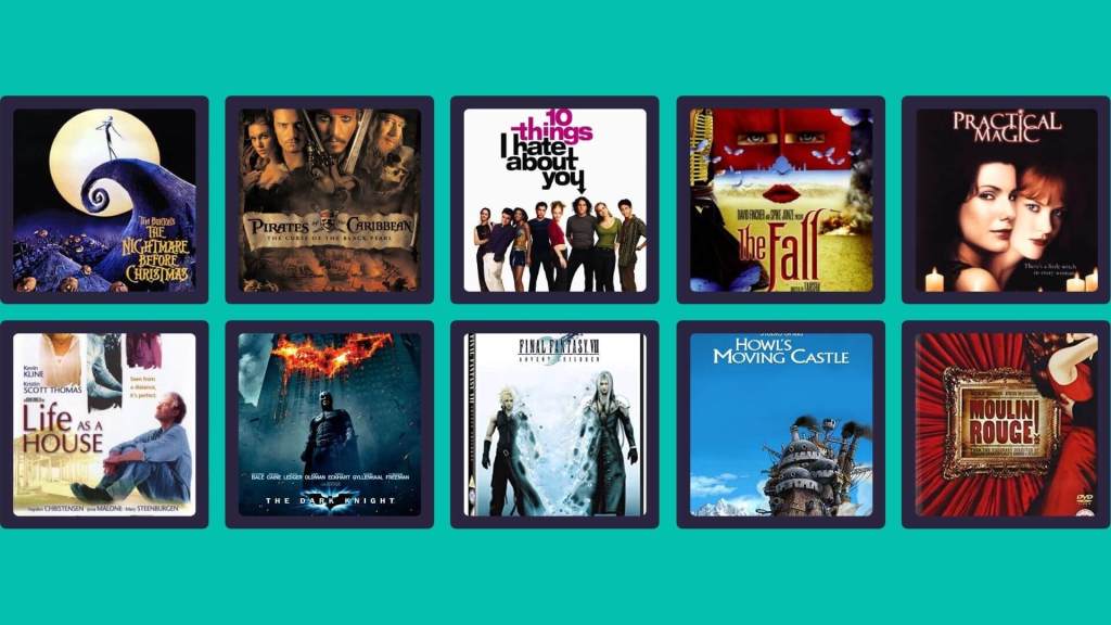 Nightmare Before Christmas, Pirates of The Caribbean, 10 Things I hate about you, The Fall, Practical Magic, Life as a house, Batman Dark Knight, Final Fantasy, Howl’s Moving Castle and Moulin Rouge.